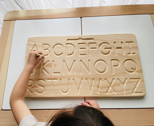 Heirloom Quality Double Sided Wooden Alphabet Tracing Board. Montessori inspired ABC uppercase lowercase wood letters tracing board